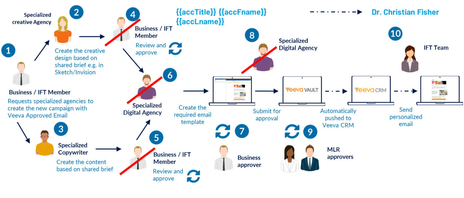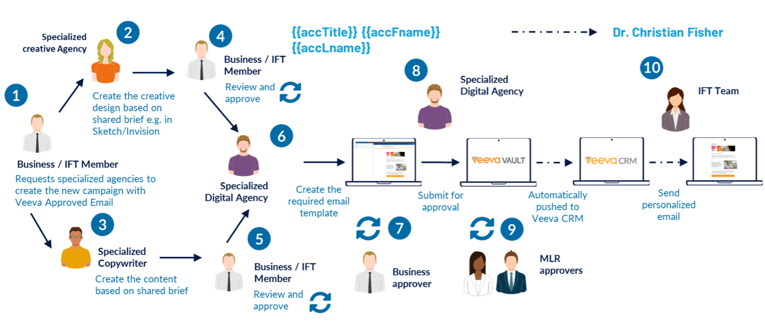 Out of the box integration with veeva crm and veeva app allows to create the faultless, simple and omni-channel process for the management and publishing of your digital assets for mlor approval and into veeva app.